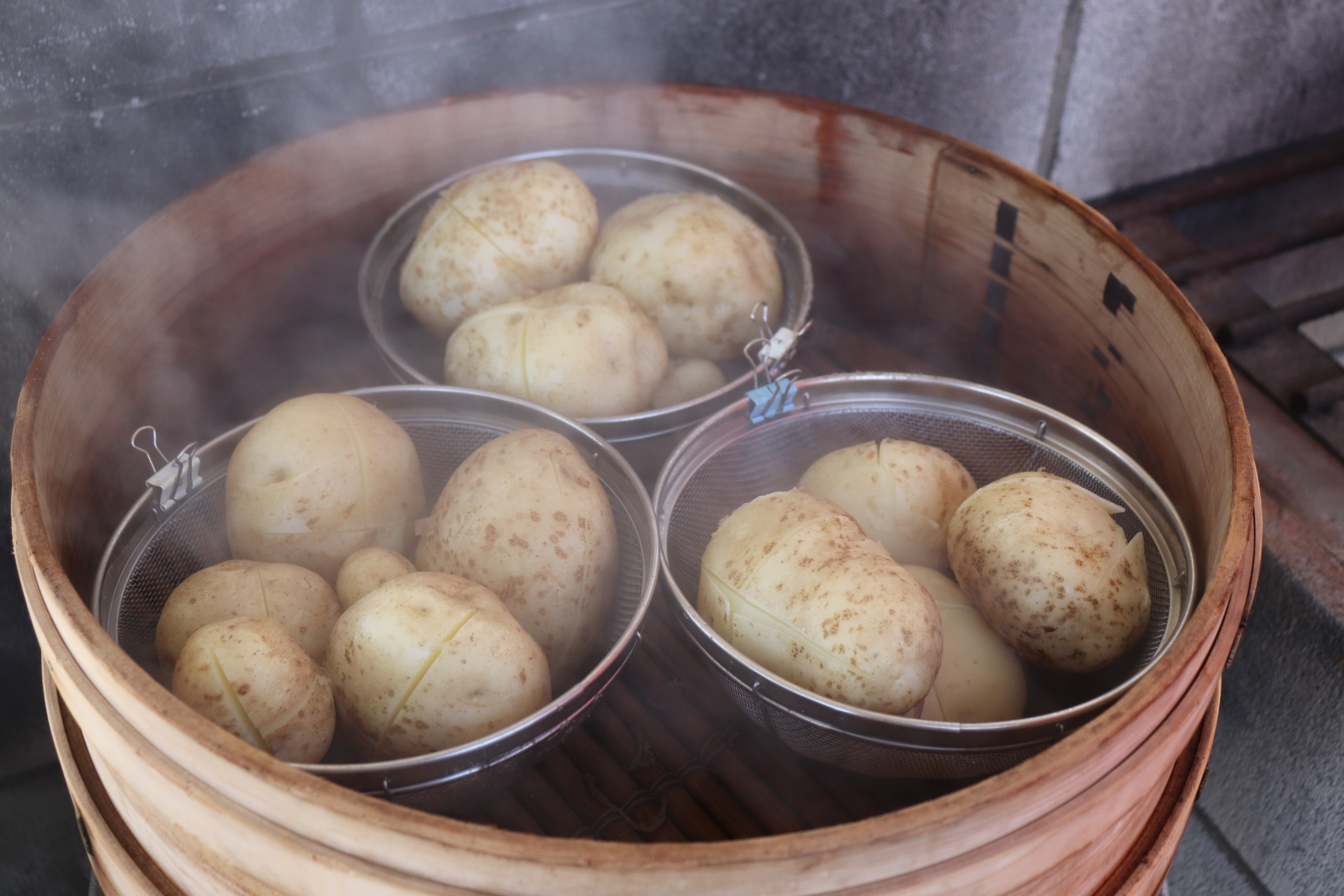 火が通りやすいようにおいもに切れ込みを入れて、せいろで1時間ほど蒸すよ🔥