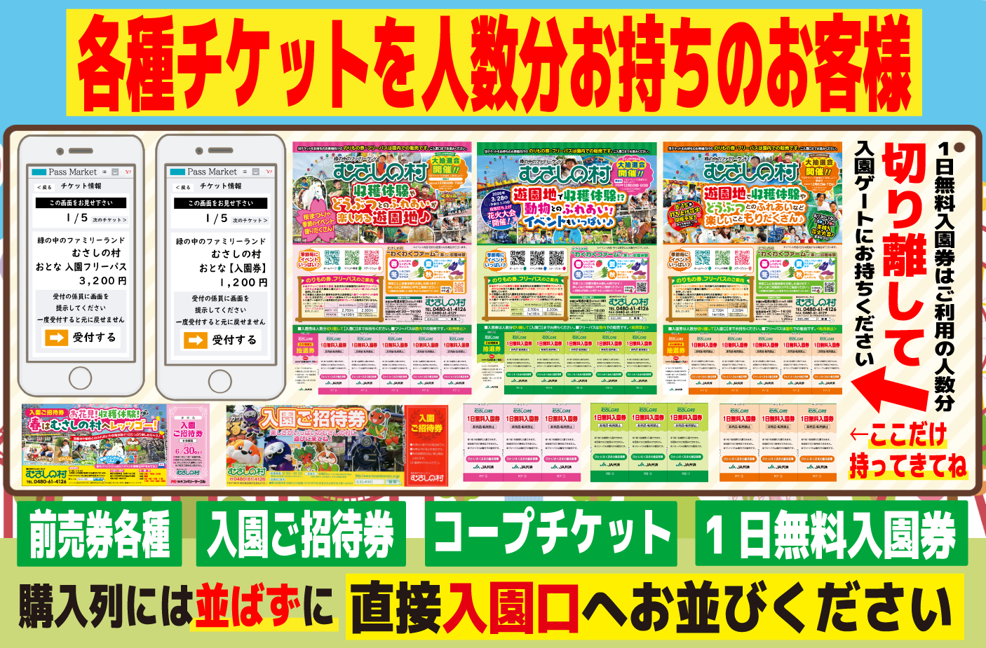 各種チケットを人数分お持ちのお客様は【入園券売場】の列には並ばずに【入園口】にお並びください。