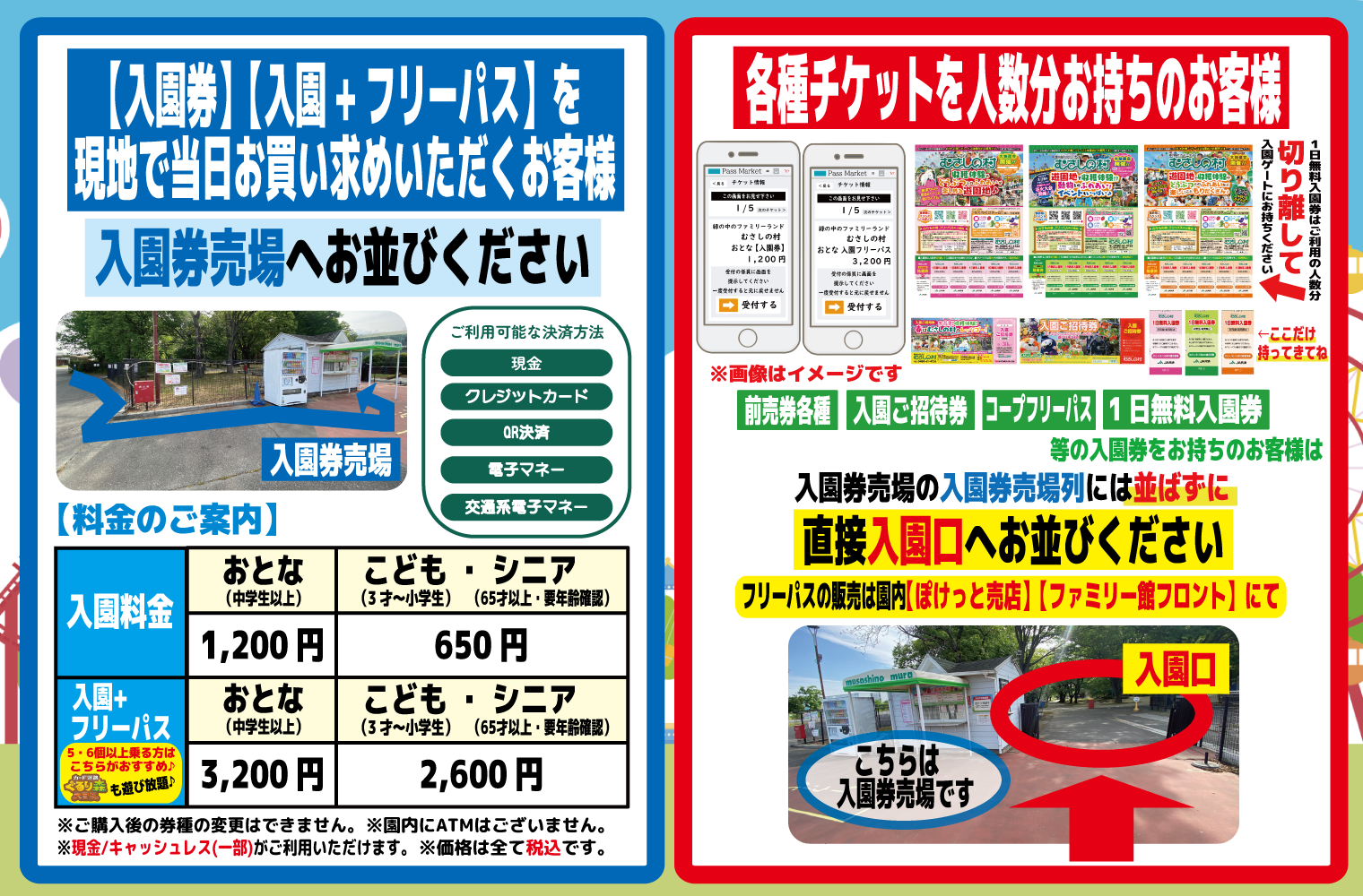 【入園券をお持ちのお客様】用の【乗物フリーパス】【のりもの券】はご入園後、園内のみでの販売となります。ご入園前の販売はございません。入園ゲート前【入園券売場】にお並びいただいても、販売がございませんので、お間違えの無いようお気を付けいただきますようお願い申し上げます。