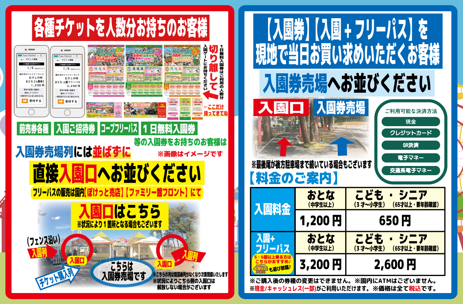 【入園券売場】に並ばずに直接【入園口】からご入園いただける【前売り入園券】【前売り入園+フリーパス】の販売を実施いたします。