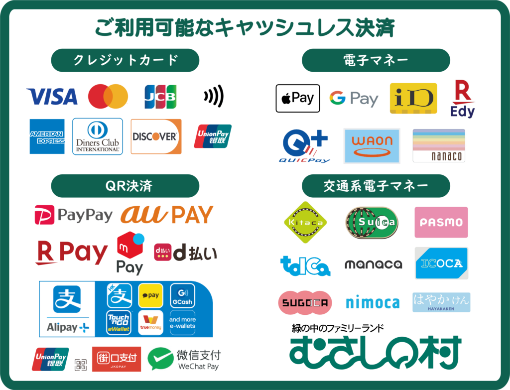 下記のクレジットカード・QR決済・電子マネー・交通系電子マネーがご利用いただけます。