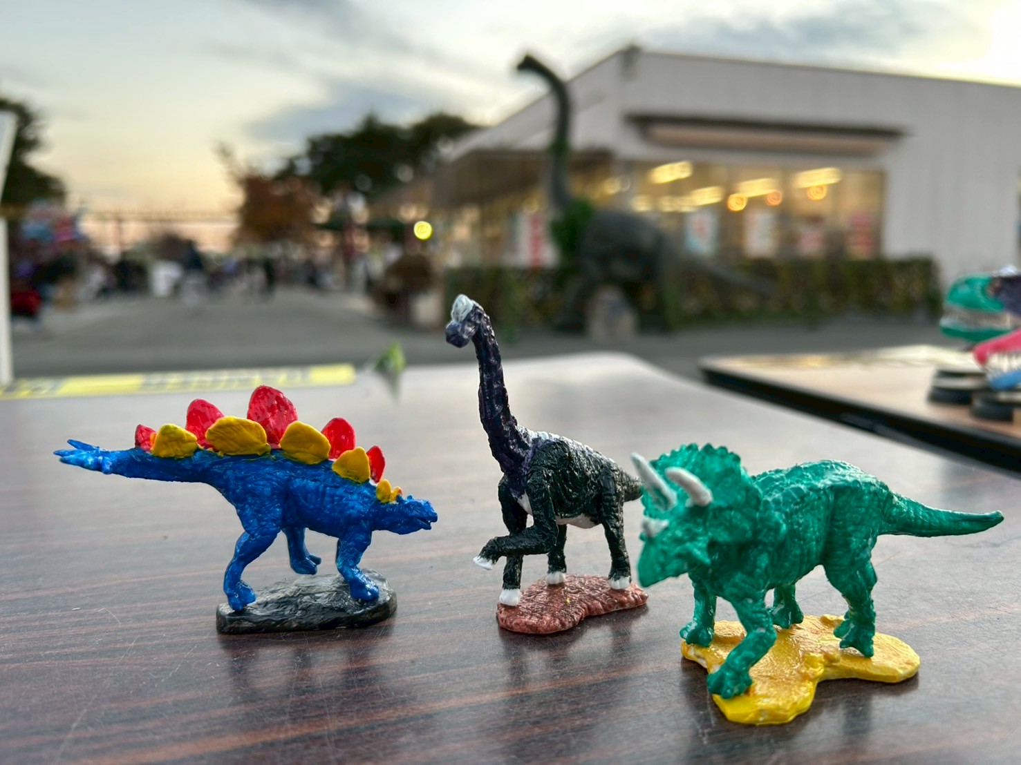 左からステゴサウルス、ブラキオサウルス、トリケラトプスの3種類!